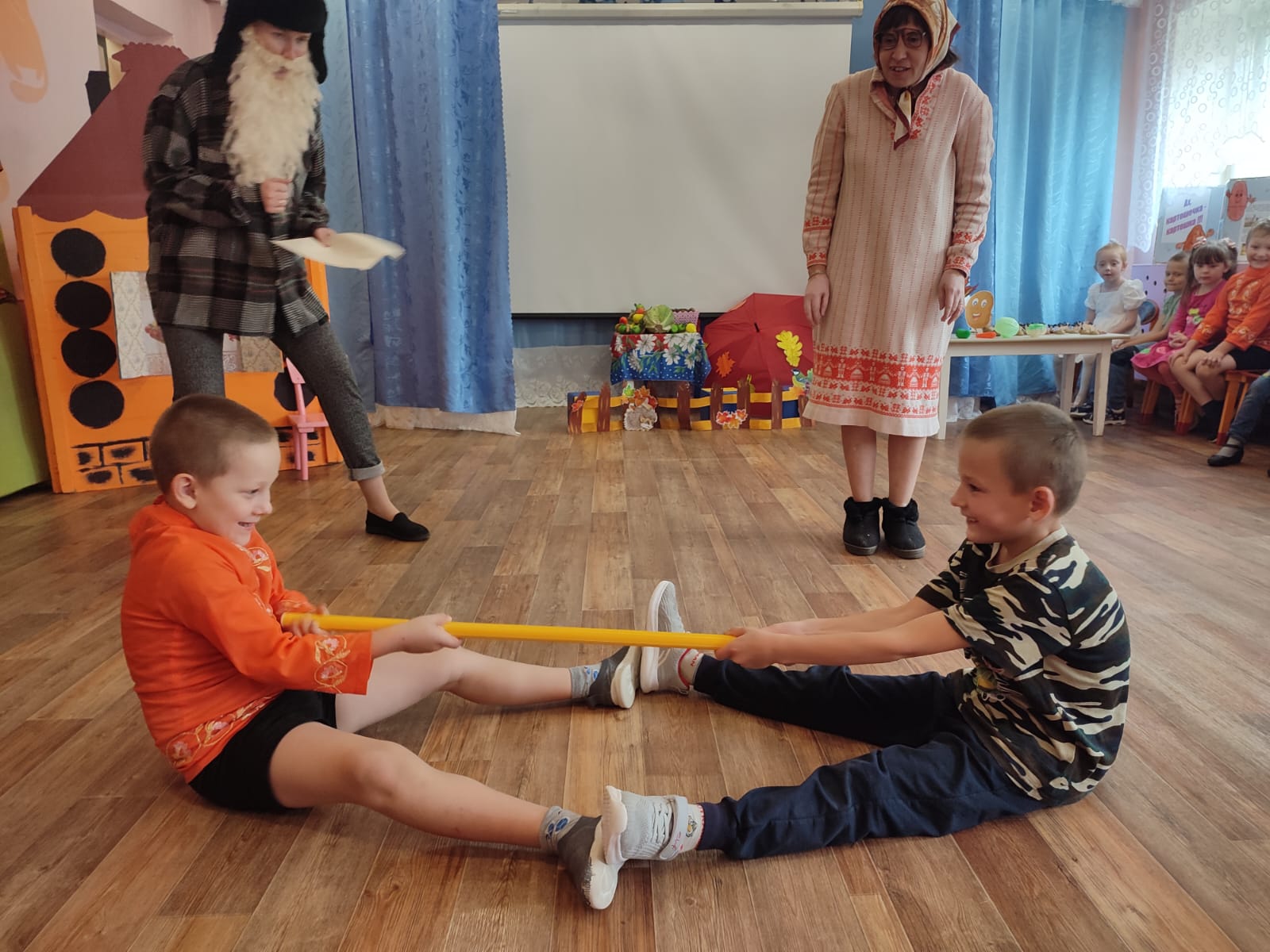 В старые времена на Руси был обычай у русских людей, как заканчивались полевые работы и был собран урожай, устраивали посиделки. Вот и Хозяйка с Дедом пригласила нас на "Капустные посиделки". Мы отгадывали загадки, водили хоровод "Мы капусту рубим, рубим". Поиграли в игру с добрыми молодцами "Перетягивание палки" и с красными девицами игра "Капуста" и многое другое. Так же у нас выступали ложкари с частушками.